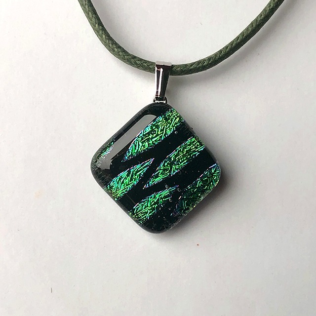大人っぽいゼブラ柄のガラスネックレス。 エメラルドグリーンに細いピンクの縁がついた 個性的なネックレスです。 ※角度によって多少色合いが変わります。 <サイズ> トップ部分・・・19mm角、奥行5mm 紐の長さ・・・42cm 重さ(紐込み)・・・7g